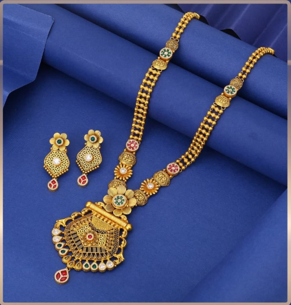 Elegant 92.5 silver gold-plated long necklace set featuring floral temple motifs and kundan-style stones. Perfect for festive and traditional wear.