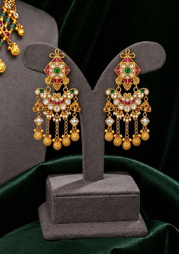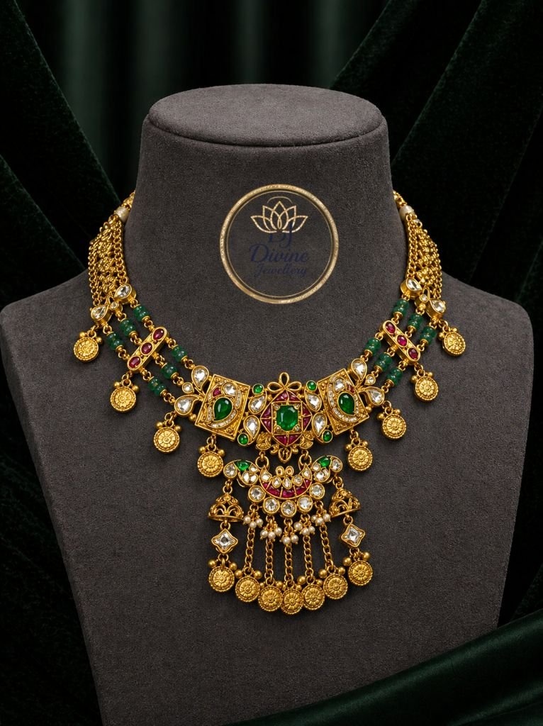 A majestic handcrafted necklace set made from premium 92.5 sterling silver. Featuring intricate kundan stonework, vibrant green and red accents, and delicate gold bead droplets, this set is available in both 24K gold and rose gold plating for a timeless, royal look.