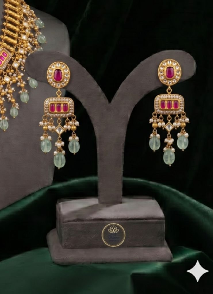 Kundan Fringe Necklace Set with Green Drop Beads & Stone Work Earrings – 92.5 Silver Gold Plated Bridal Jewellery