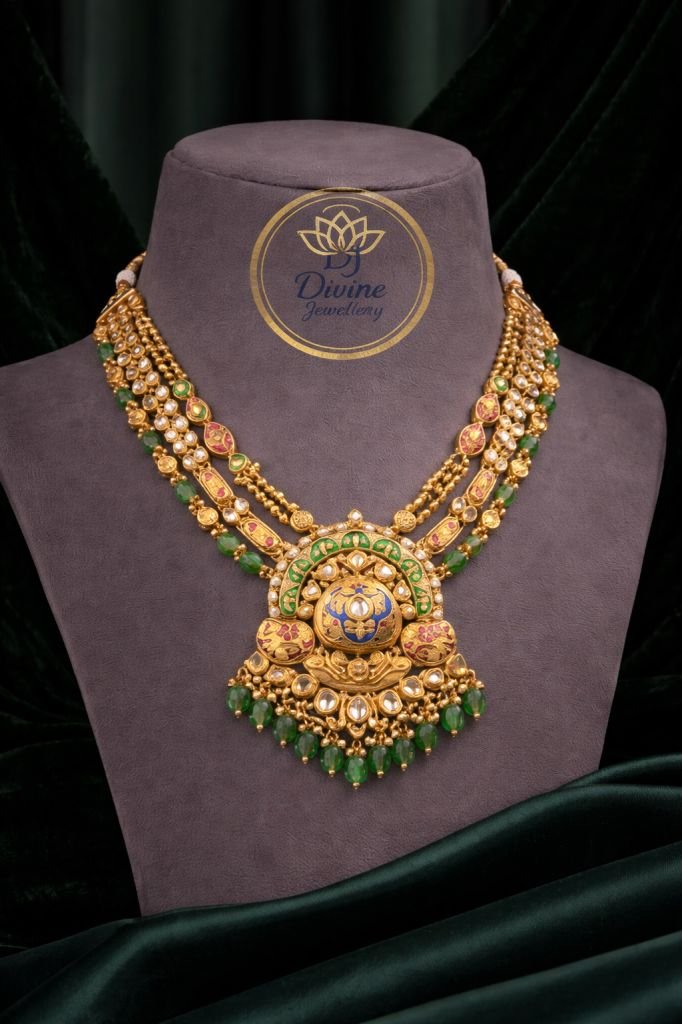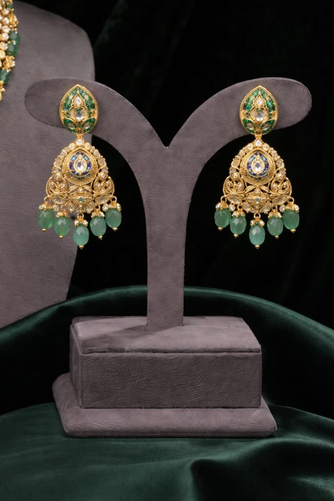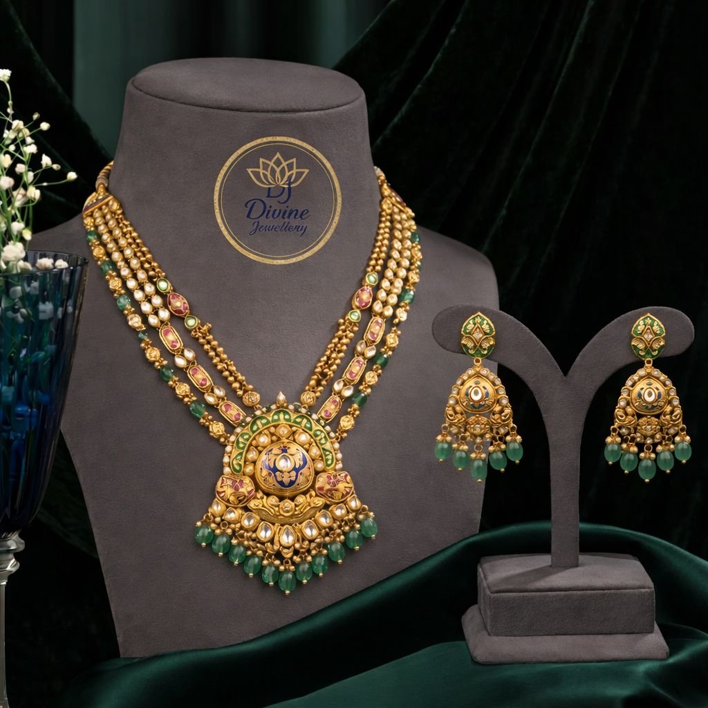 Elegant layered kundan long necklace with temple pendant, green bead drops & jhumka earrings in 92.5 silver gold plating—perfect for bridal & festive wear.