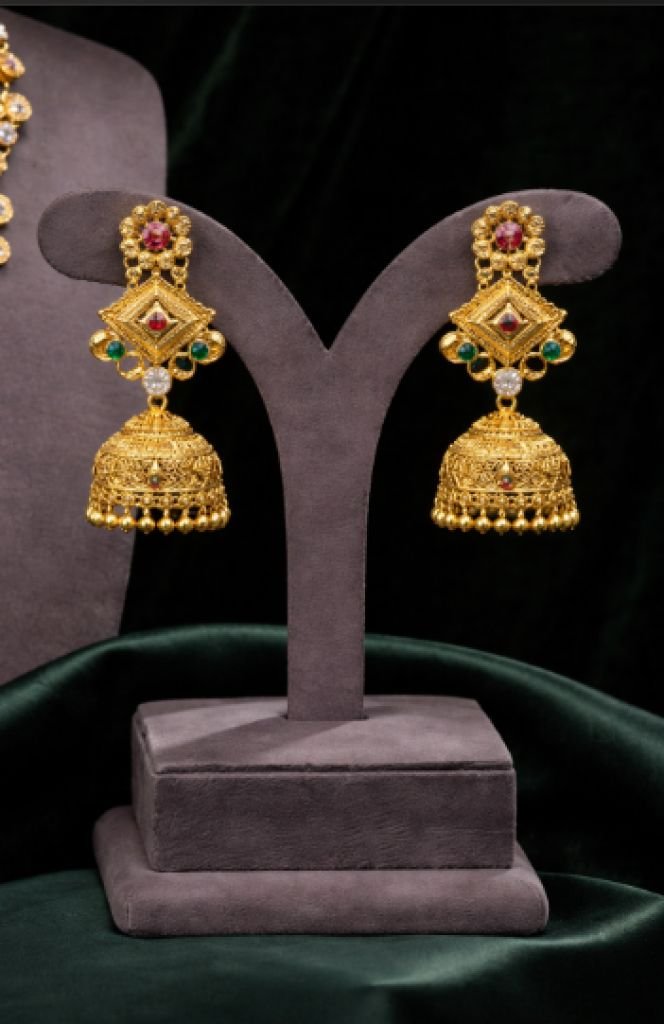 Elegant layered temple necklace set with intricate gold plating, multicolor stones, and detailed pendant design for a rich traditional look.
