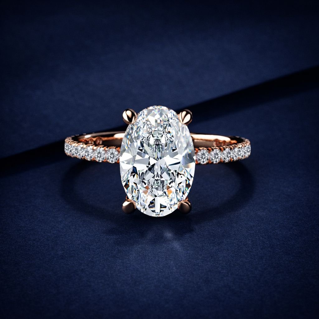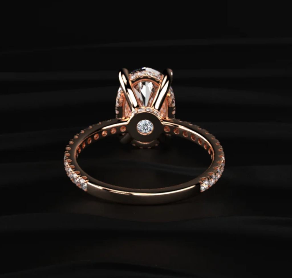 Luxurious Oval Cut Diamond Engagement Ring in Rose Gold – Hidden Halo Pave Band