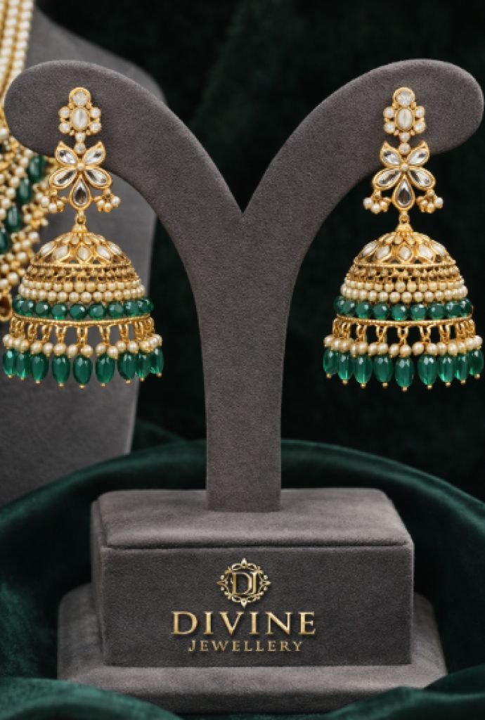 Luxury Pearl Layered Green Polki Style Necklace Set with Kundan & Jhumka Earrings – 92.5 Silver Gold Plated Bridal Jewellery | Divine Jewellery