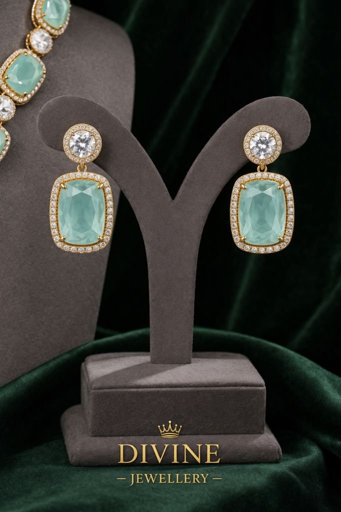 Minimal Aqua Green Stone Necklace Set with CZ Accents | 92.5 Silver Gold Plated Elegant Jewellery by Divine Jewellery