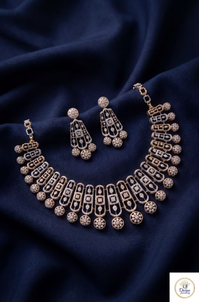 Modern Geometric Diamond Necklace Set with Earrings in 92.5 Silver Gold Plated | Divine Jewellery