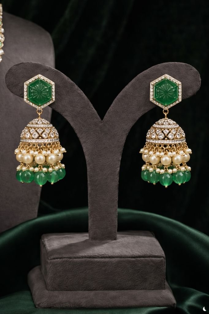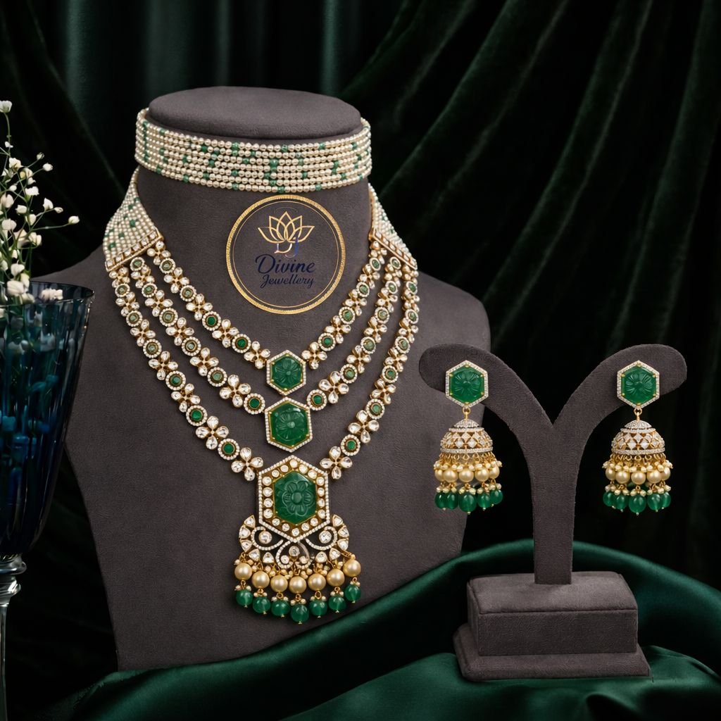 Multi-Layer Emerald Stone Bridal Necklace Set with Choker – 92.5 Silver Gold Plated Premium Jewellery