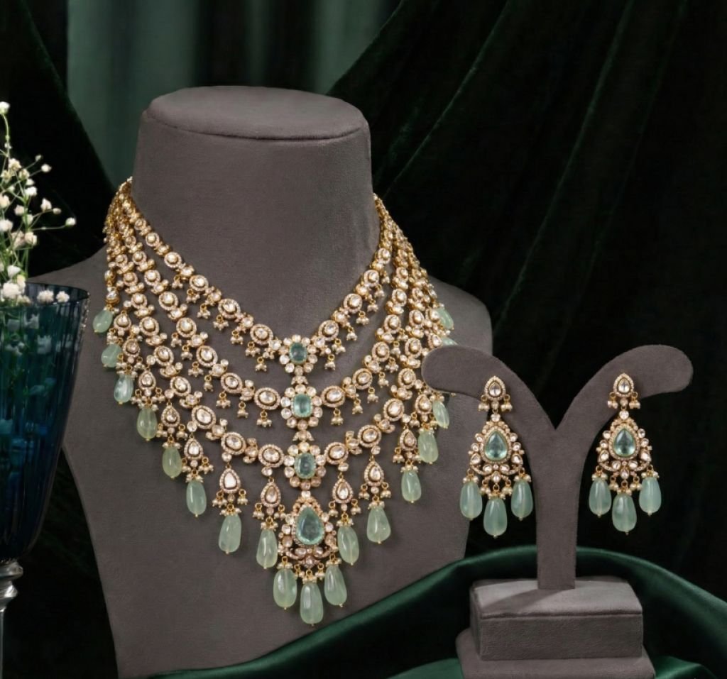 Grand multi-layer kundan necklace with pastel green drops and royal bridal styling.