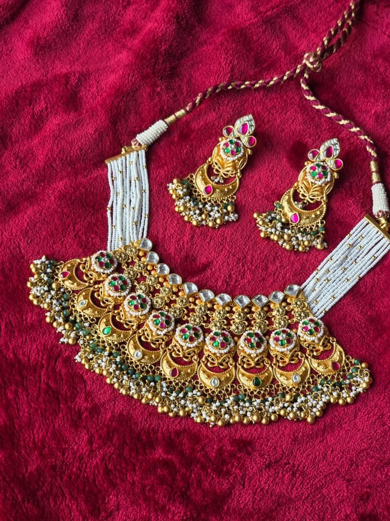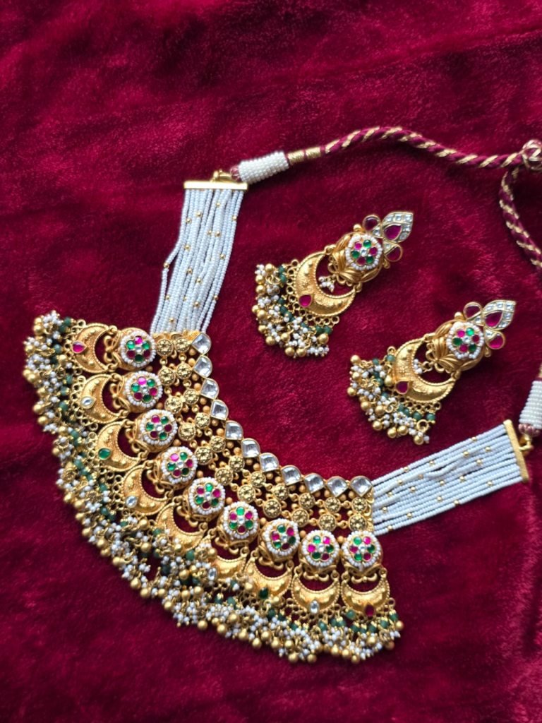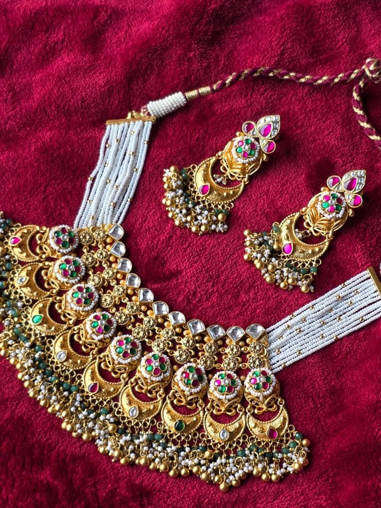 The matching earrings reflect the same crescent and floral theme, finished with ruby touches, green bead bunches, and golden danglers for a complete bridal look. This set is ideal for brides, wedding ceremonies, receptions, and traditional celebrations. It pairs beautifully with silk sarees, bridal lehengas, and royal ethnic ensembles, delivering a powerful heritage statement.