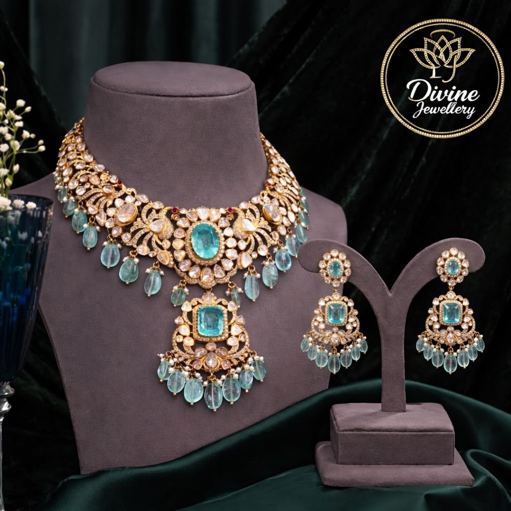 Royal Aqua Kundan Necklace Set with Statement Pendant & Drop Earrings – 92.5 Silver Gold Plated