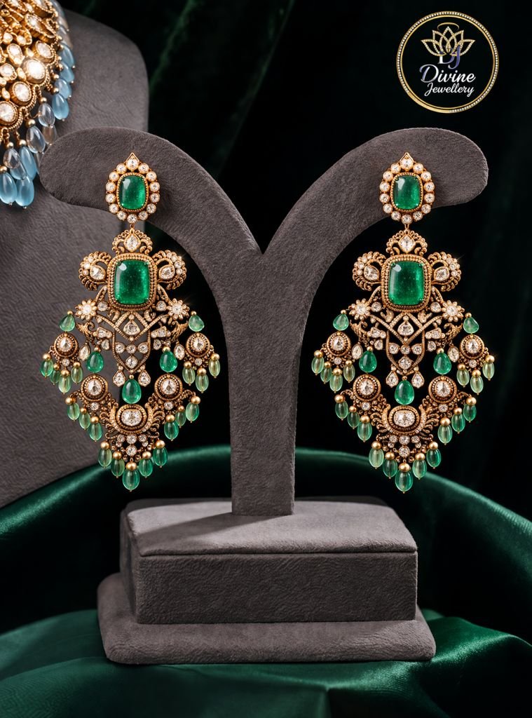 Royal Emerald Kundan Necklace Set with Grand Statement Pendant & Chandbali Earrings – 92.5 Silver Gold Plated