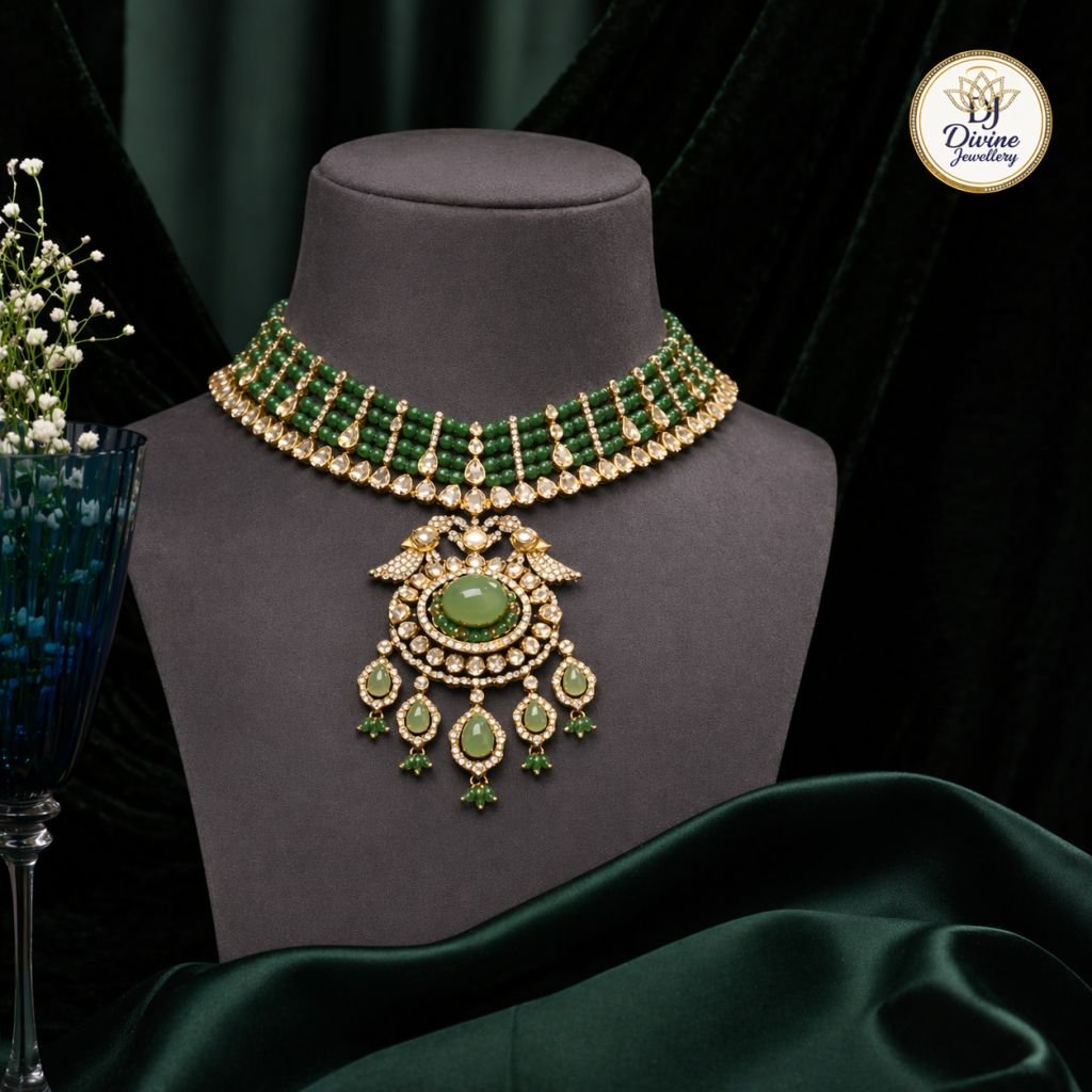 Elegant green stone choker with kundan detailing, pearl layers and statement pendant in 92.5 silver gold plating—perfect for bridal & festive wear.