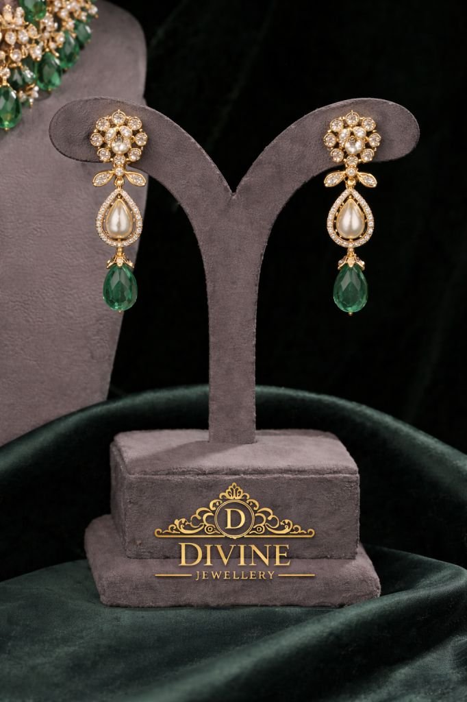 A luxurious choker necklace set featuring classic kundan-style stones with elegant emerald green drop beads, crafted in 92.5 silver with rich gold plating. Perfect for bridal and festive occasions.