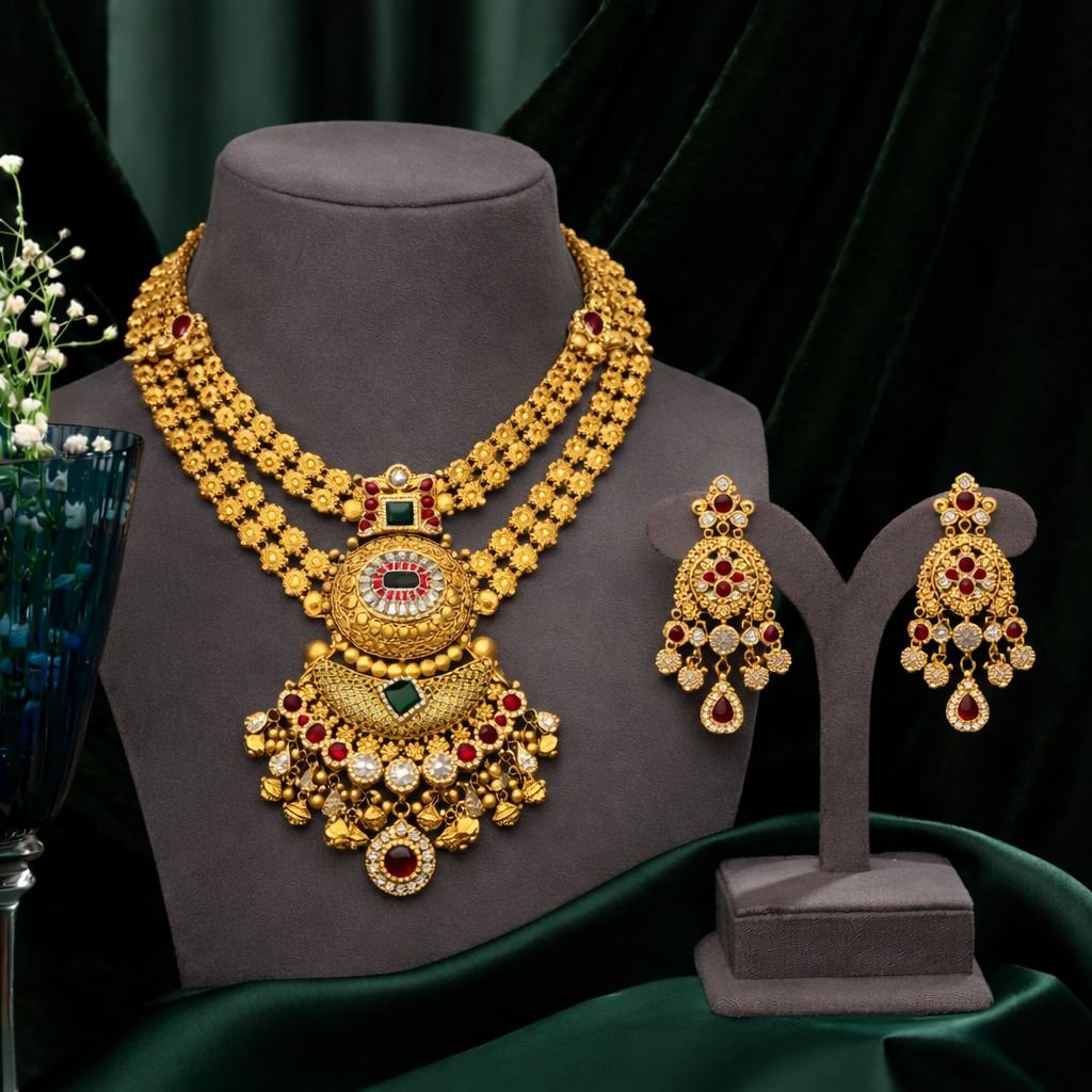 Royal Layered Temple Necklace Set with Red & Green Stones – 92.5 Silver Gold Plated Bridal Jewellery | Divine Jewellery
