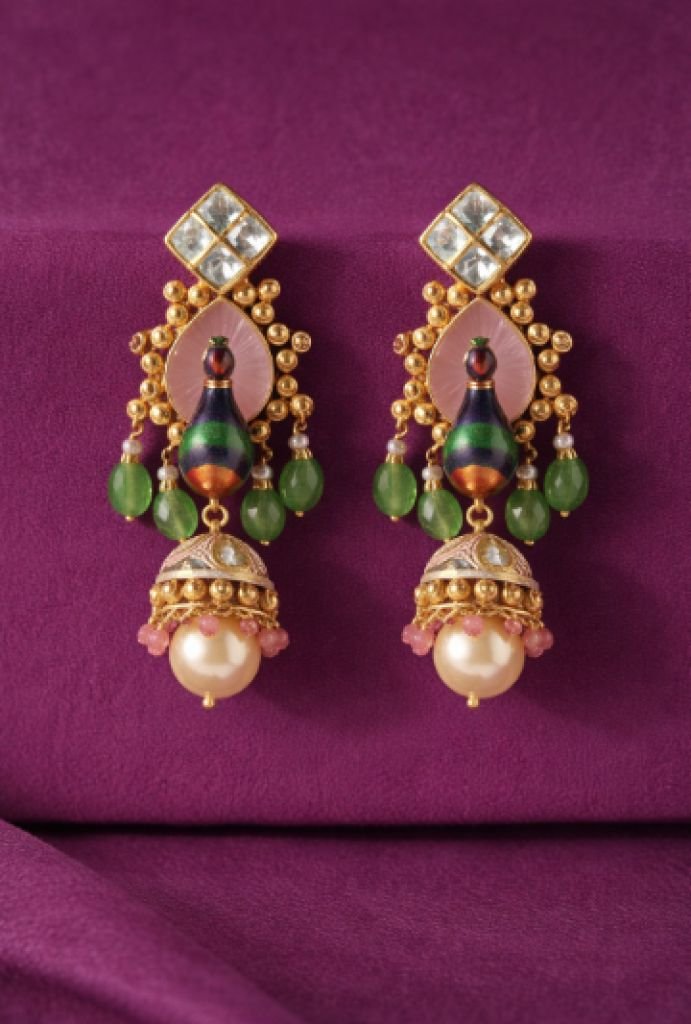 Royal Peacock Pendant Necklace Set with Pink Beads – 92.5 Silver Gold Plated Statement Jewellery | Divine Jewellery