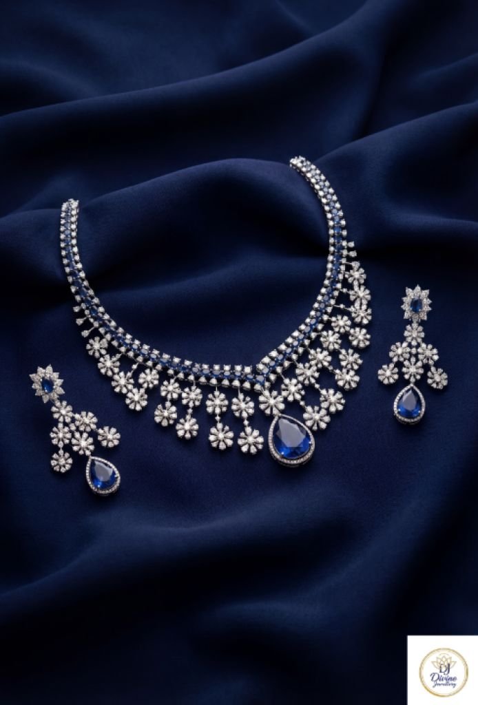 A graceful sapphire blue necklace set with floral diamond-style detailing and elegant drop earrings, crafted in 92.5 silver for a luxurious finish.
