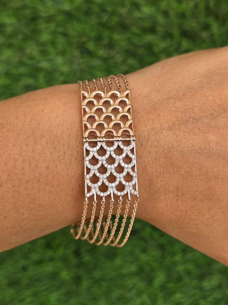 Product Type: Designer Statement Bracelet Style: Multi-Chain Wide Bracelet Design Theme: Scallop / Fish-scale Pattern Stone Type: High-shine crystal stones Finish: Premium Rose Gold Plated Occasion: Party, Wedding, Cocktail, Festive, Evening