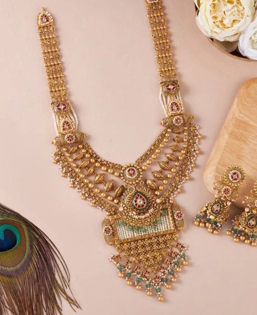 Grand temple-style layered necklace set crafted in 92.5 silver with gold plating, featuring intricate detailing, pearl accents, green bead drops, and matching earrings—perfect for bridal and festive wear.