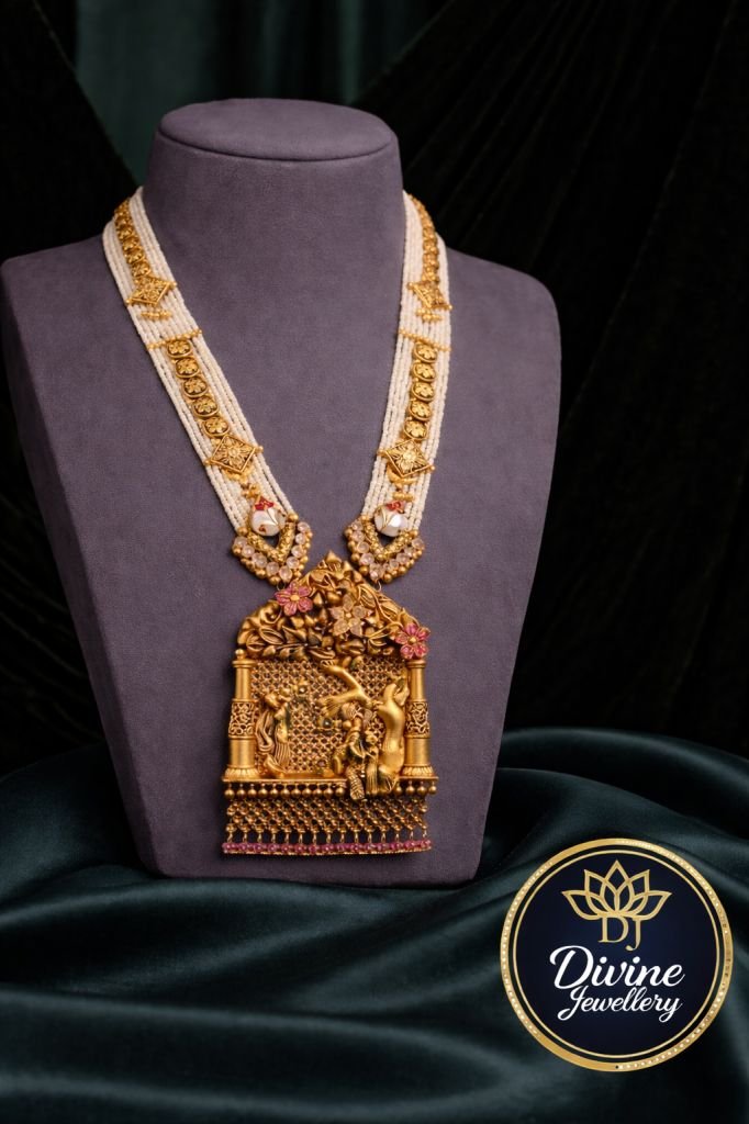 Grand temple-style long necklace with pearl strands and intricately carved pendant in 92.5 silver gold plating—perfect for bridal & premium occasions.