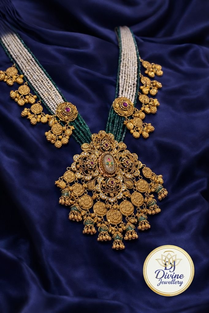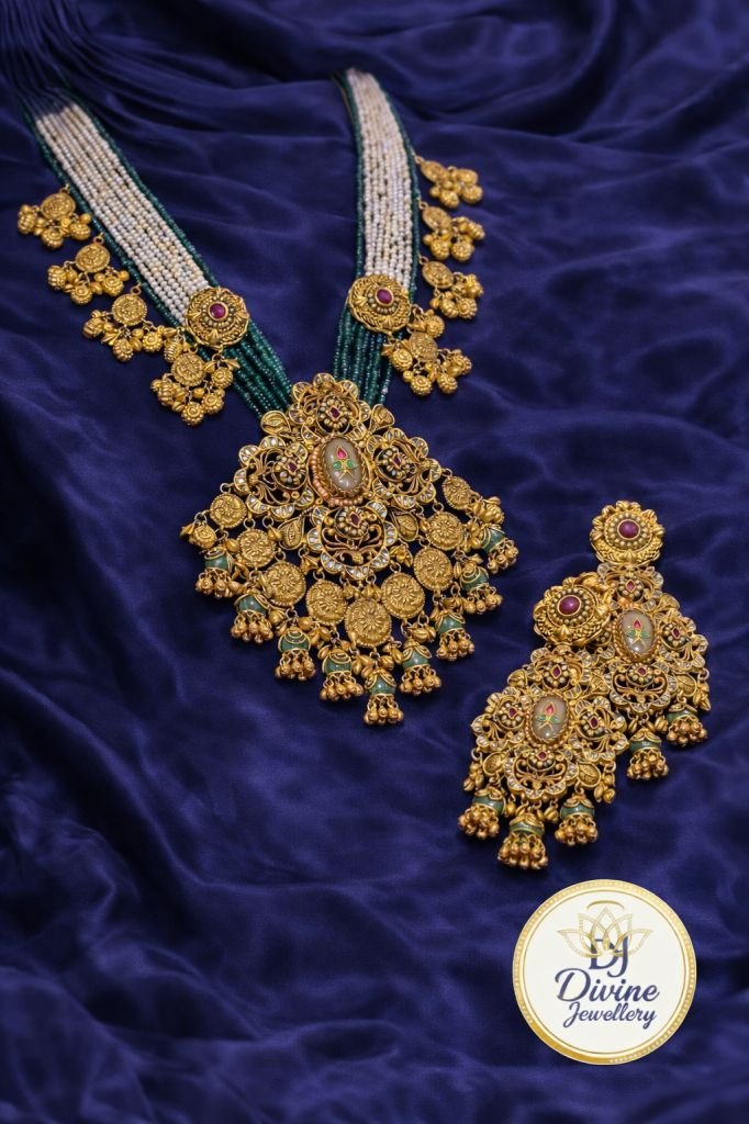 Elegant 92.5 silver gold-plated long necklace set featuring multi-strand beads, temple motifs, intricate detailing, and matching jhumka earrings. Perfect for bridal and festive wear. Customizable in gold or rose gold plating.