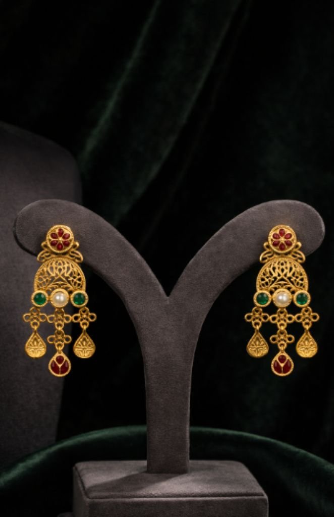 Classic temple-style necklace set featuring a structured chain with a dome-shaped pendant and elegant hanging drops, crafted in 92.5 silver with gold plating.