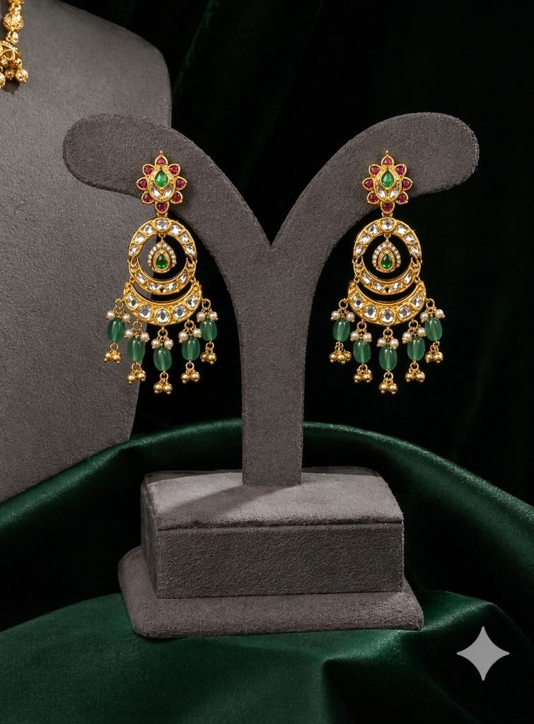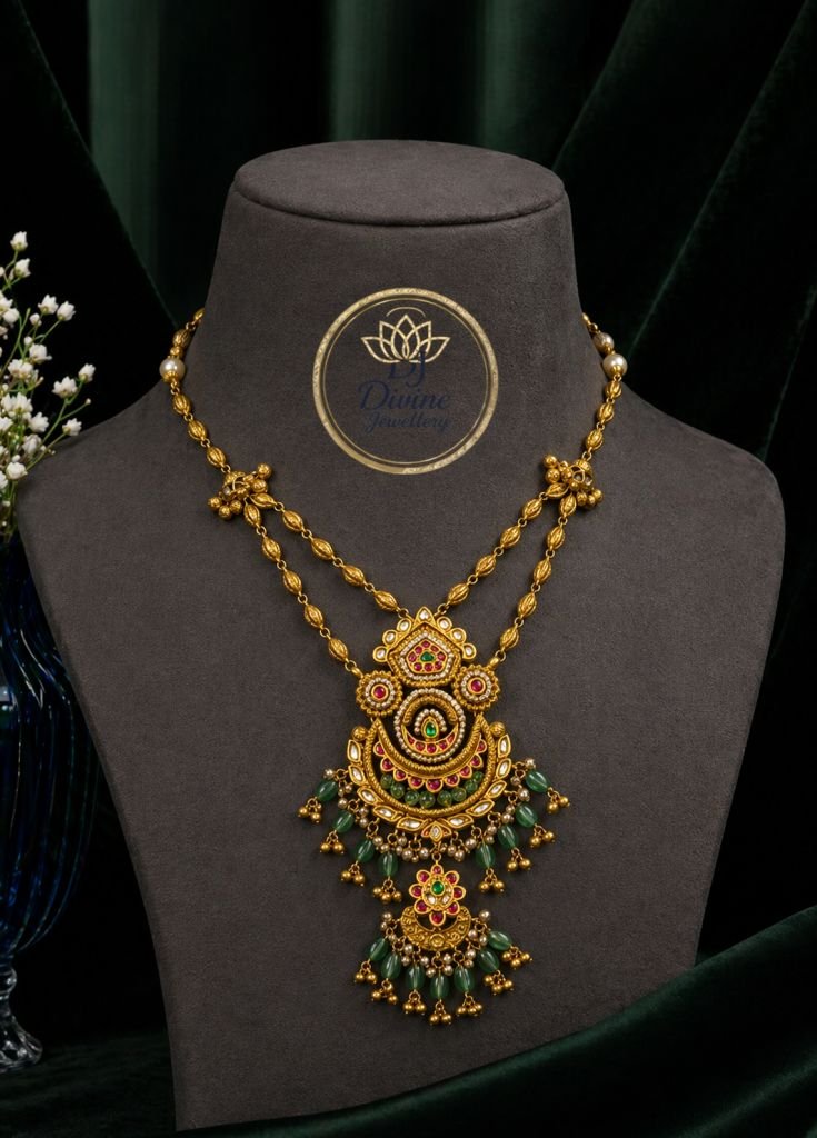 Traditional Layered Pendant Necklace Set with Green Beads – 92.5 Silver Gold Plated