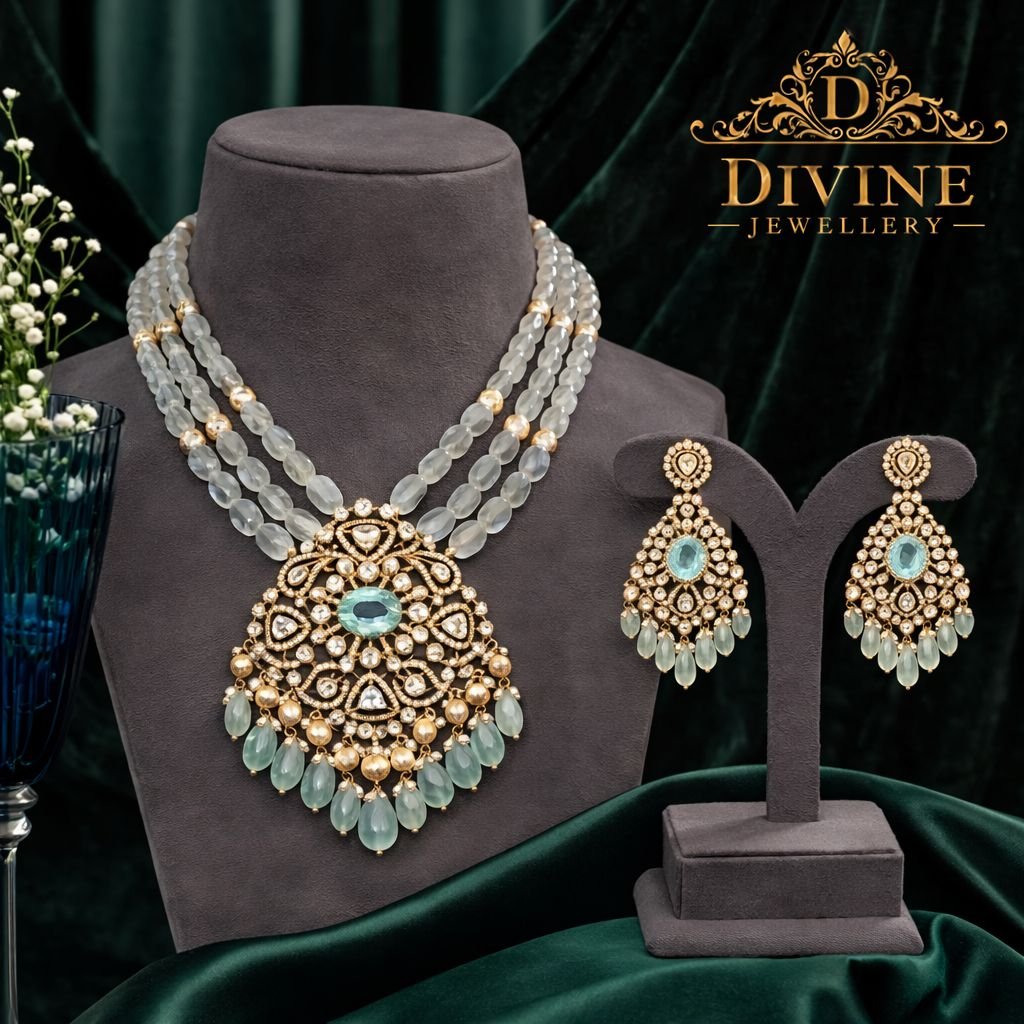 Aqua Stone Layered Necklace Set with Statement Pendant | 92.5 Silver Gold Plated Jewellery by Divine Jewellery