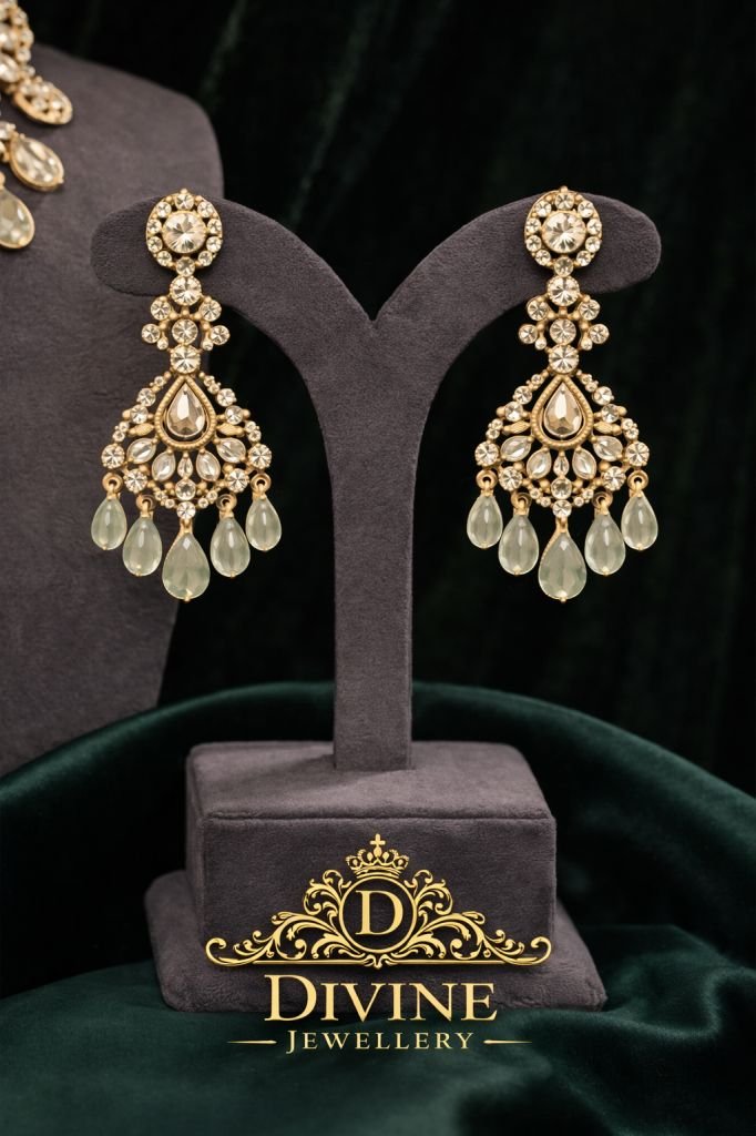 Elegant champagne polki choker with crystal drop detailing and matching statement earrings.
