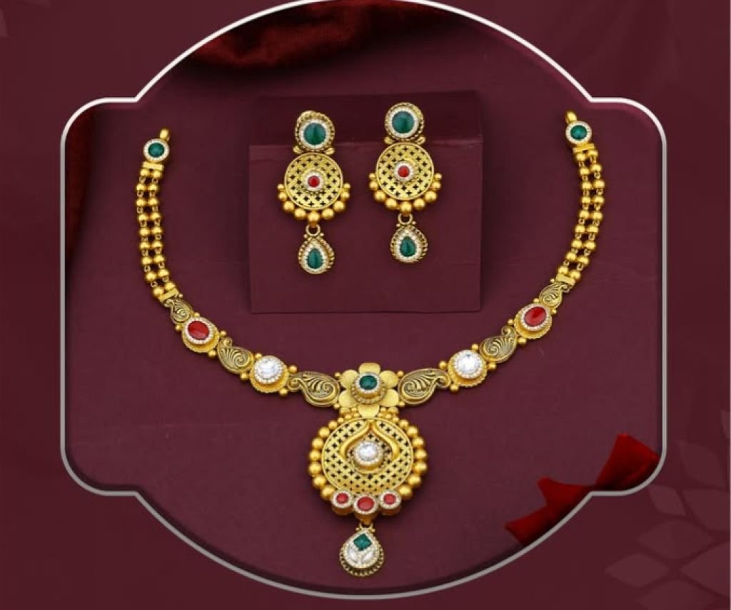 Elegant 92.5 silver gold-plated necklace set featuring round filigree floral design with red, green, and white kundan-style stones. Perfect for festive and traditional wear.