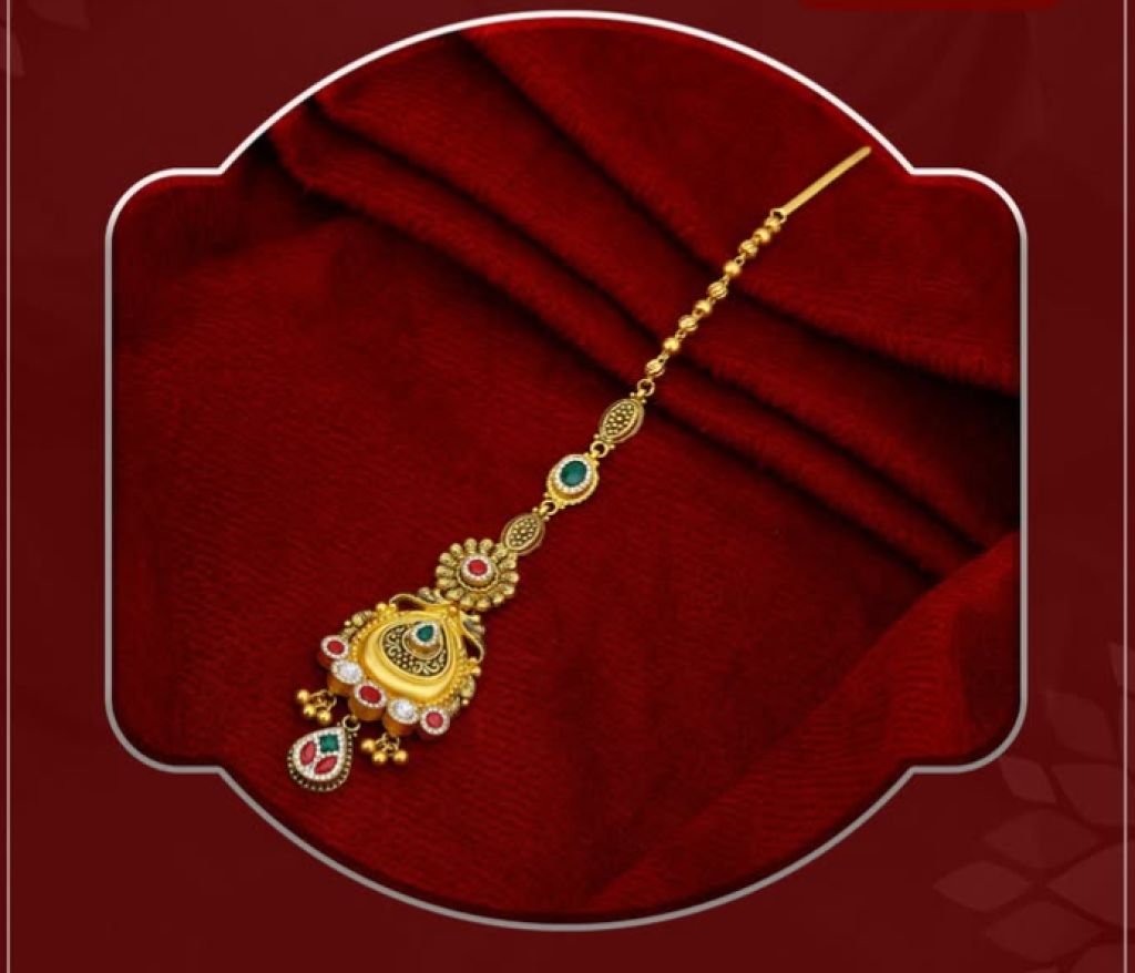 Elegant 92.5 silver gold-plated maang tikka featuring temple teardrop design with red, green, and white kundan-style stones. Perfect for bridal and festive wear.