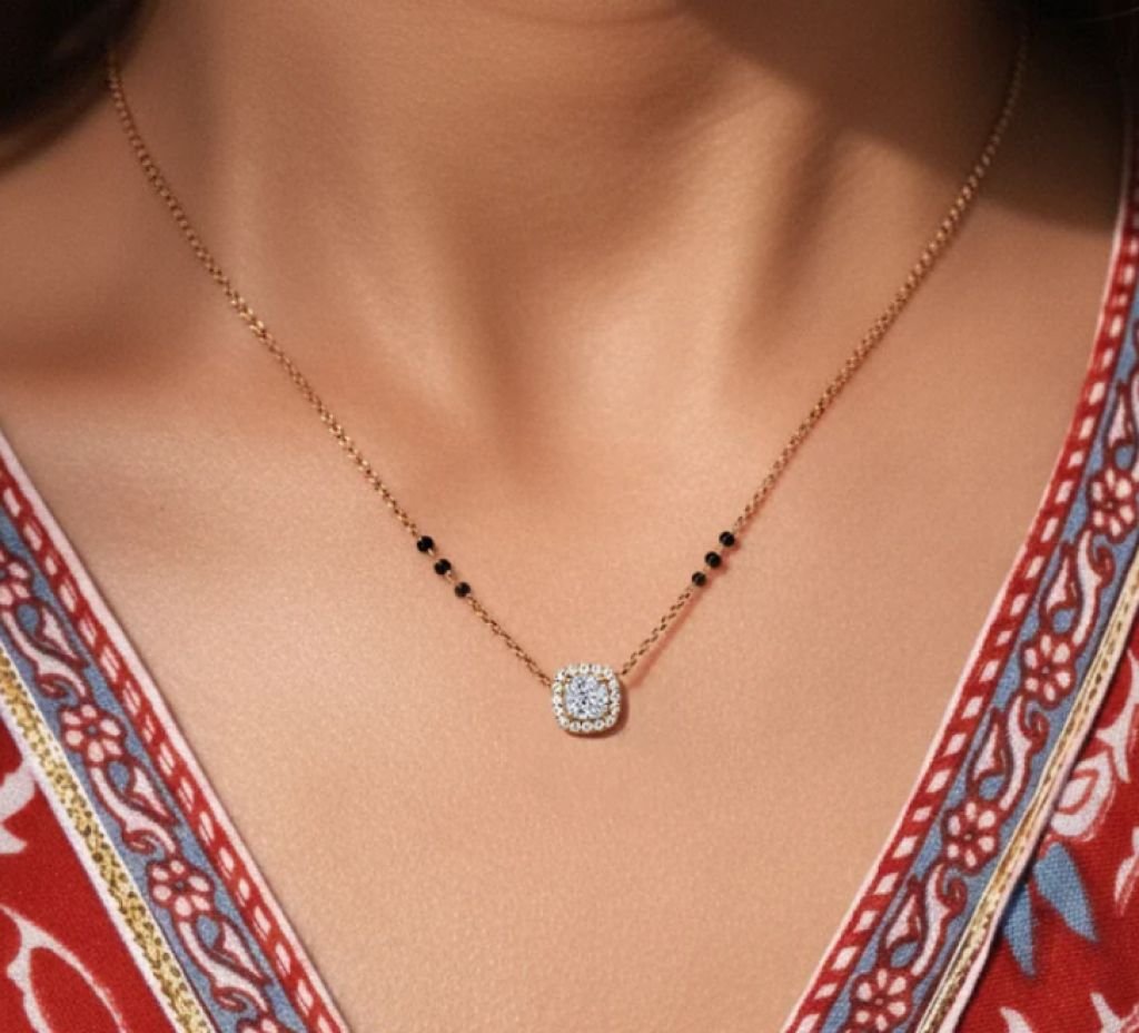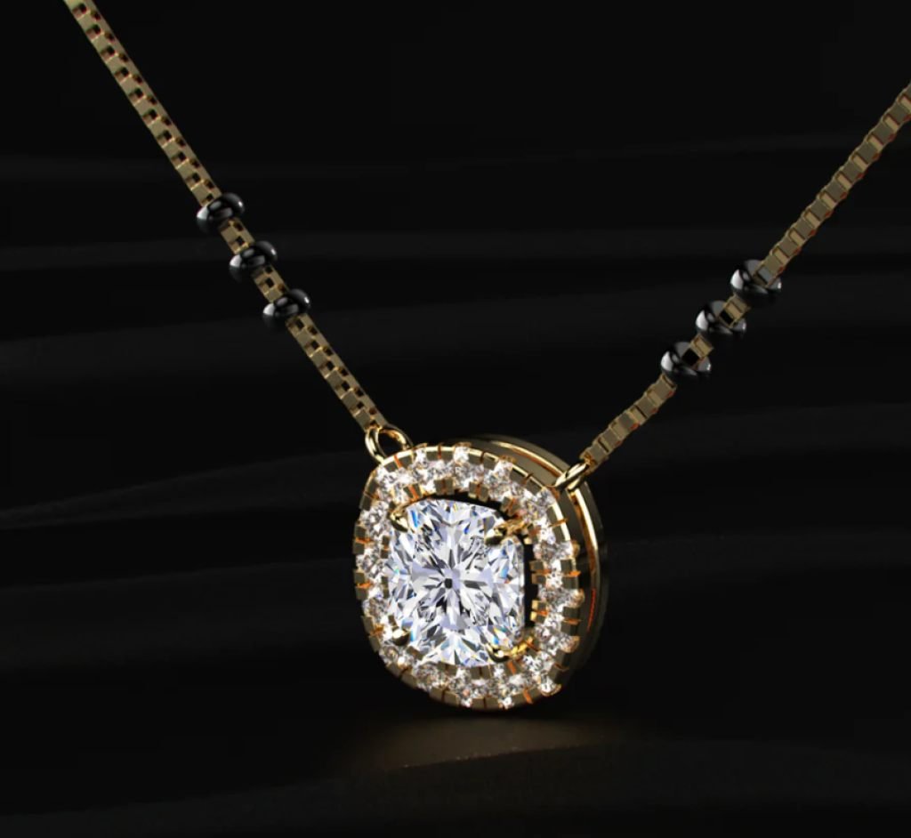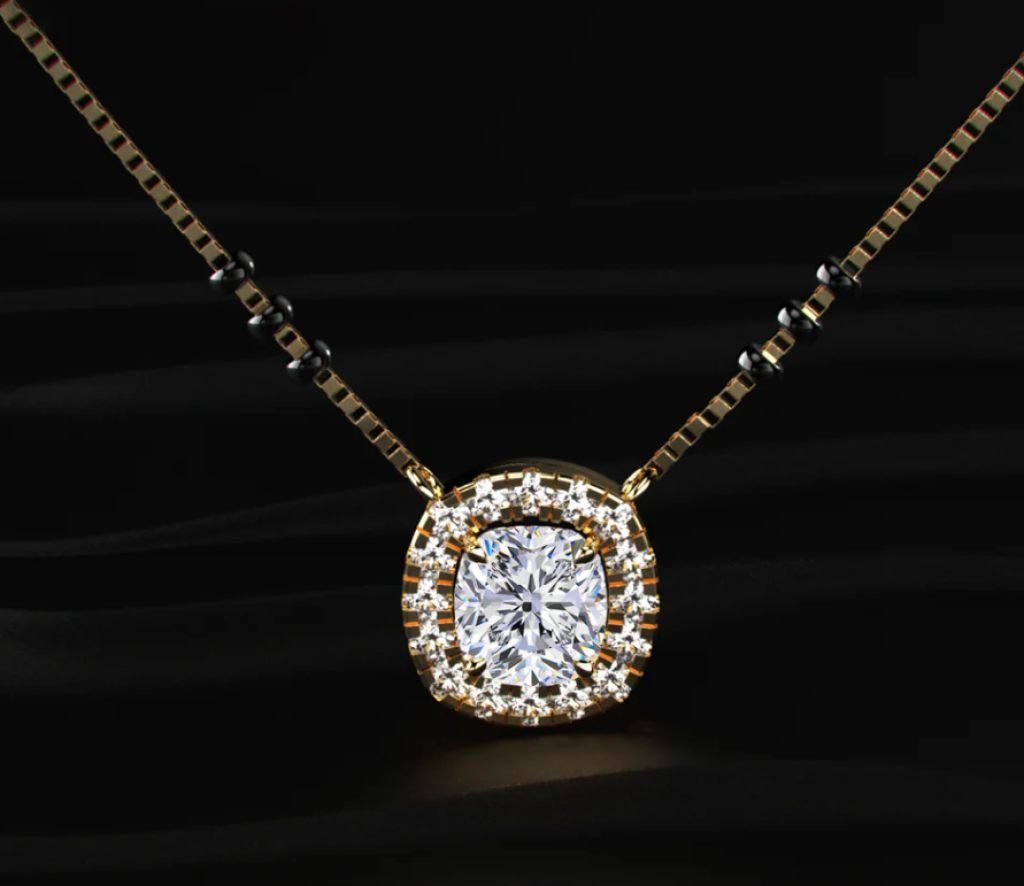 DIVINE 92.5 Sterling Silver Cushion Cut Mangalsutra – 14K Gold Plated Soft-Square Halo Pendant