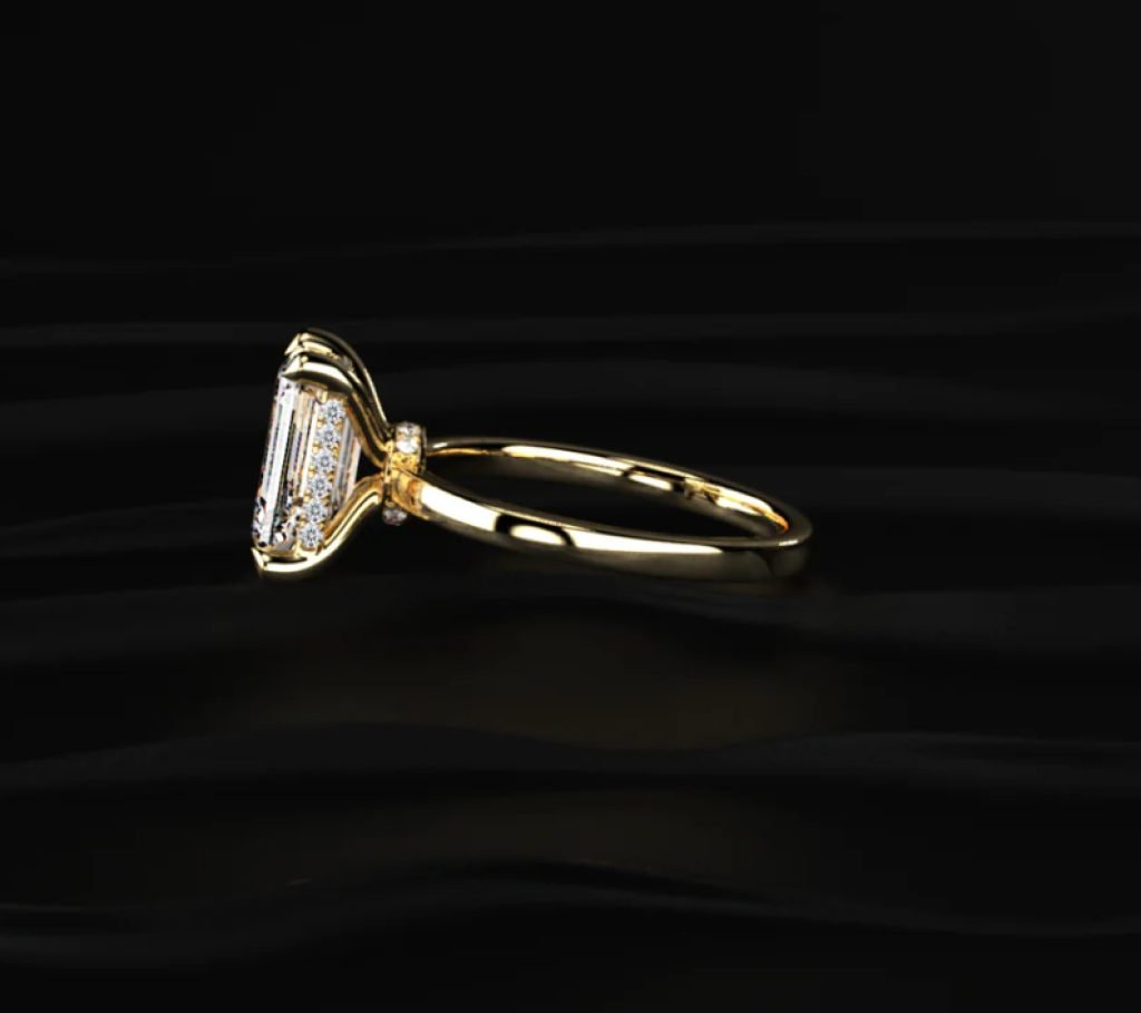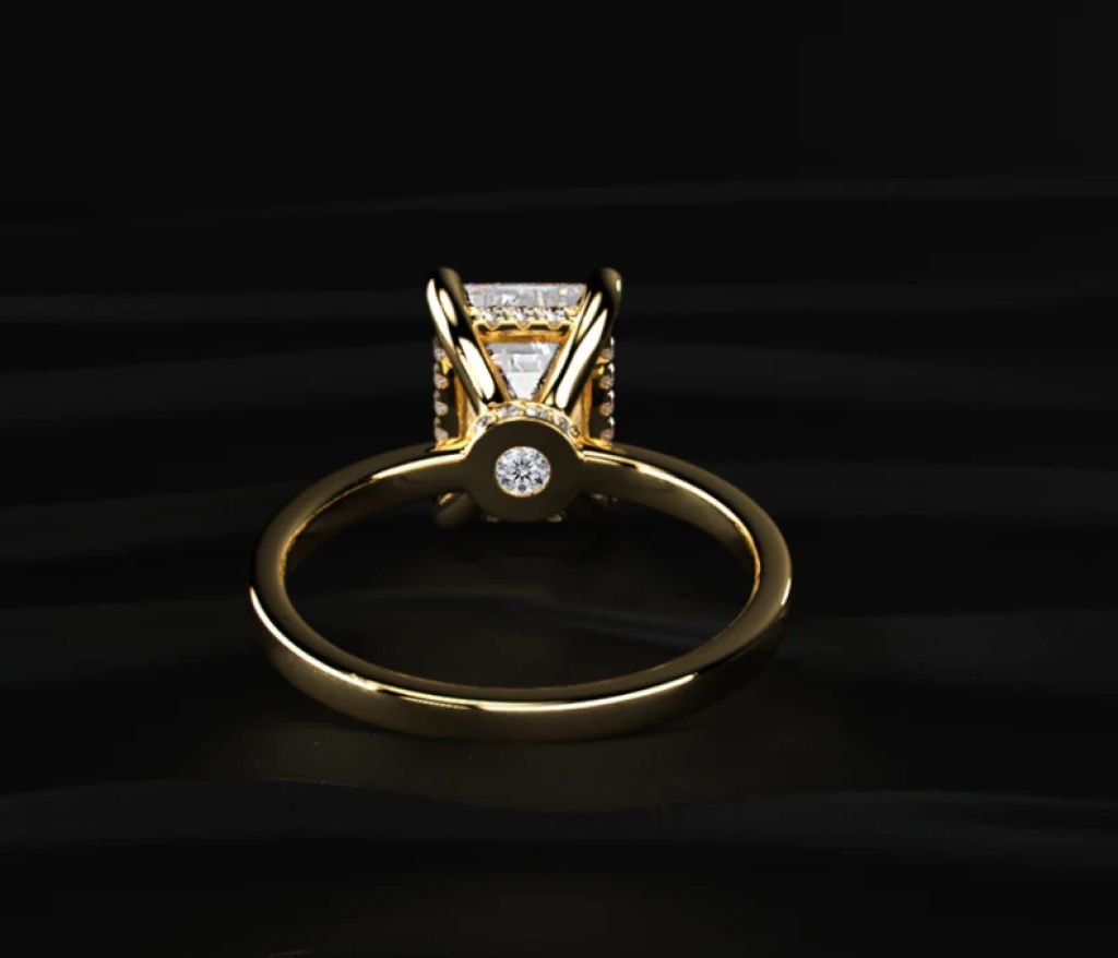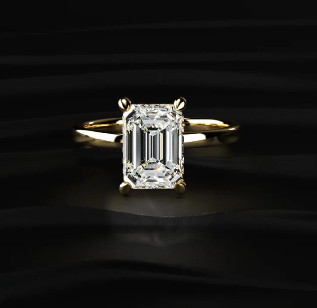 Sophisticated and timeless. This DIVINE original features a large Emerald Cut center stone set in hallmarked 92.5 Sterling Silver with a luxurious gold-plated finish, perfect for those who appreciate understated elegance.