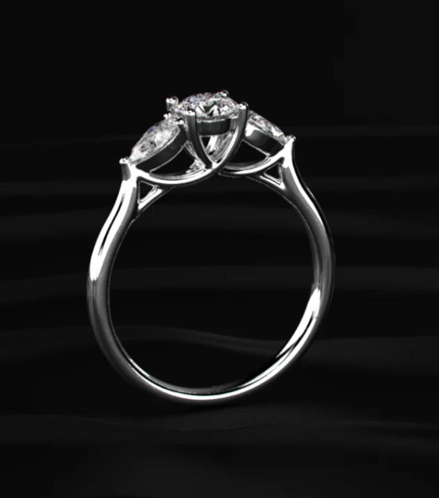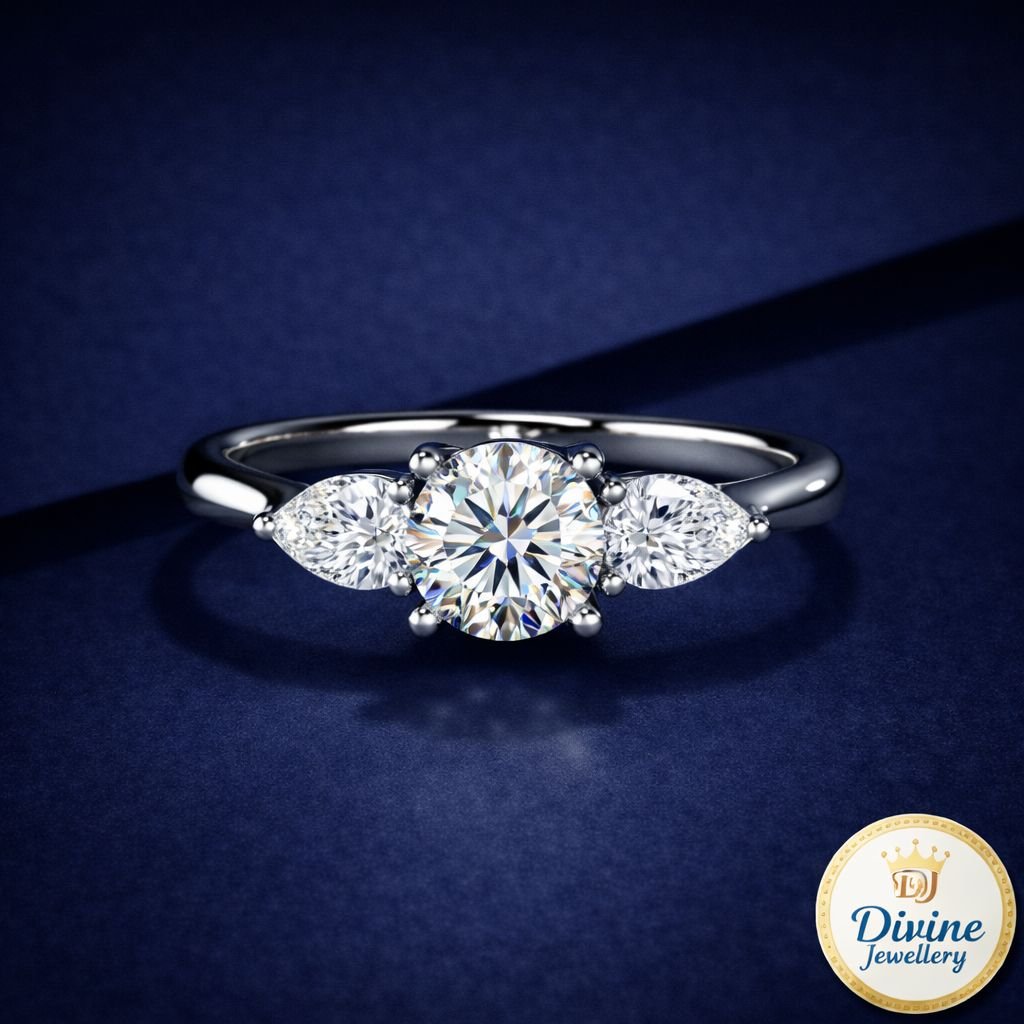DIVINE 92.5 Sterling Silver Three-Stone Ring – Round Brilliant and Pear Cut Platinum Plated
