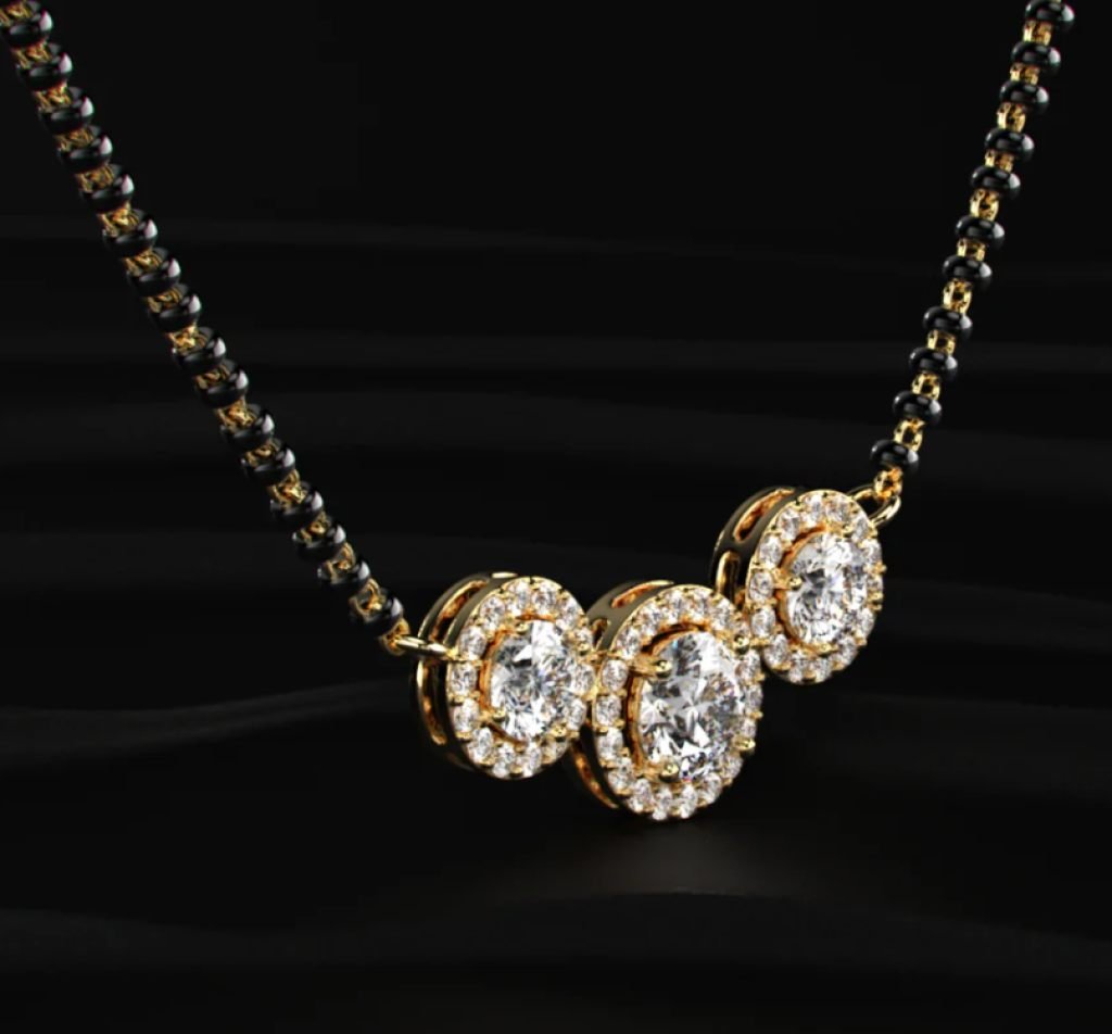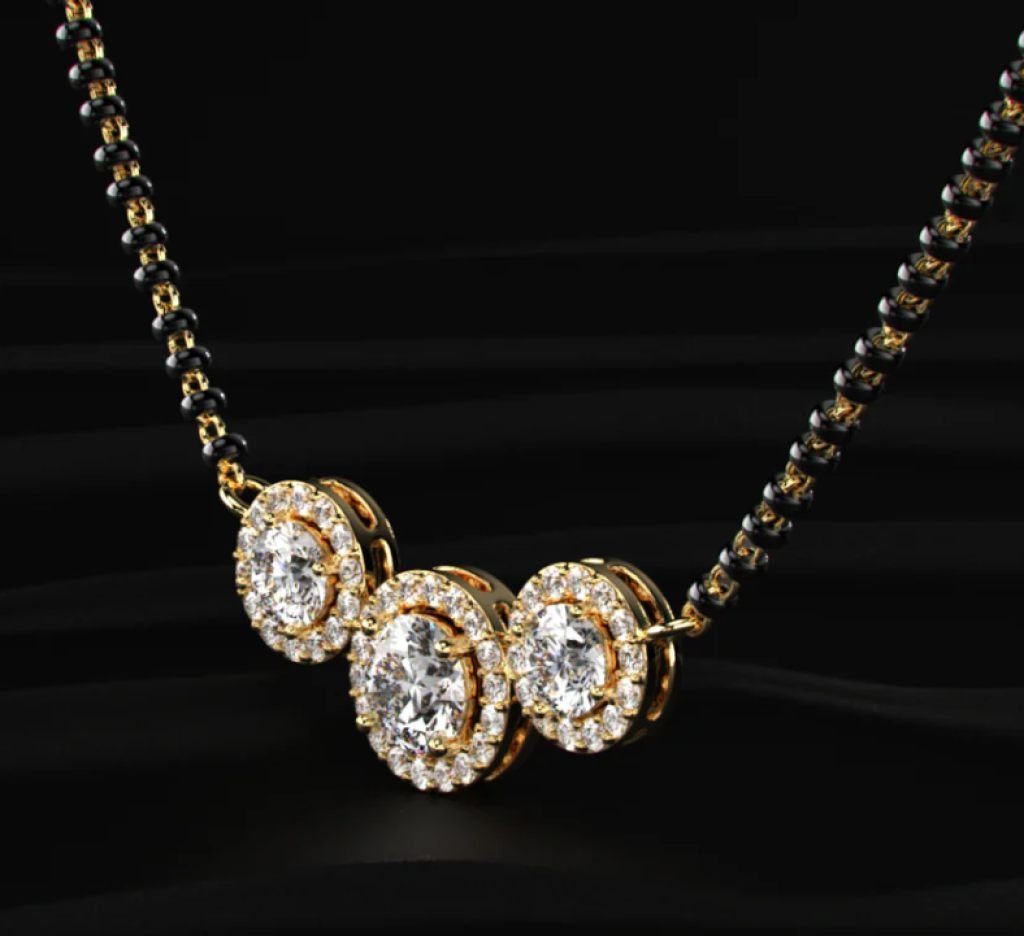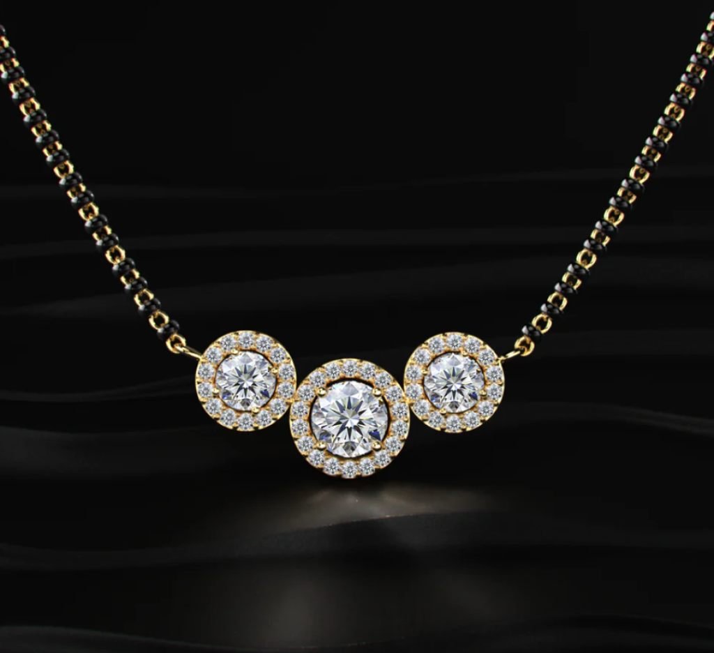 DIVINE 92.5 Sterling Silver Triple Halo Mangalsutra – 14K Gold Plated Traditional Black Bead Chain