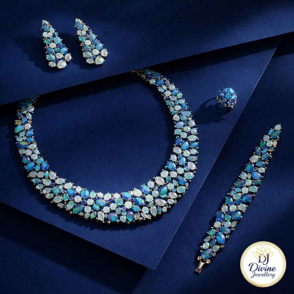 The DIVINE Azure Celeste Statement Jewellery Set is designed for those who love modern luxury with a powerful visual impact. Featuring a rich arrangement of shimmering blue stones in an elegant crescent silhouette, this set reflects light beautifully from every angle.