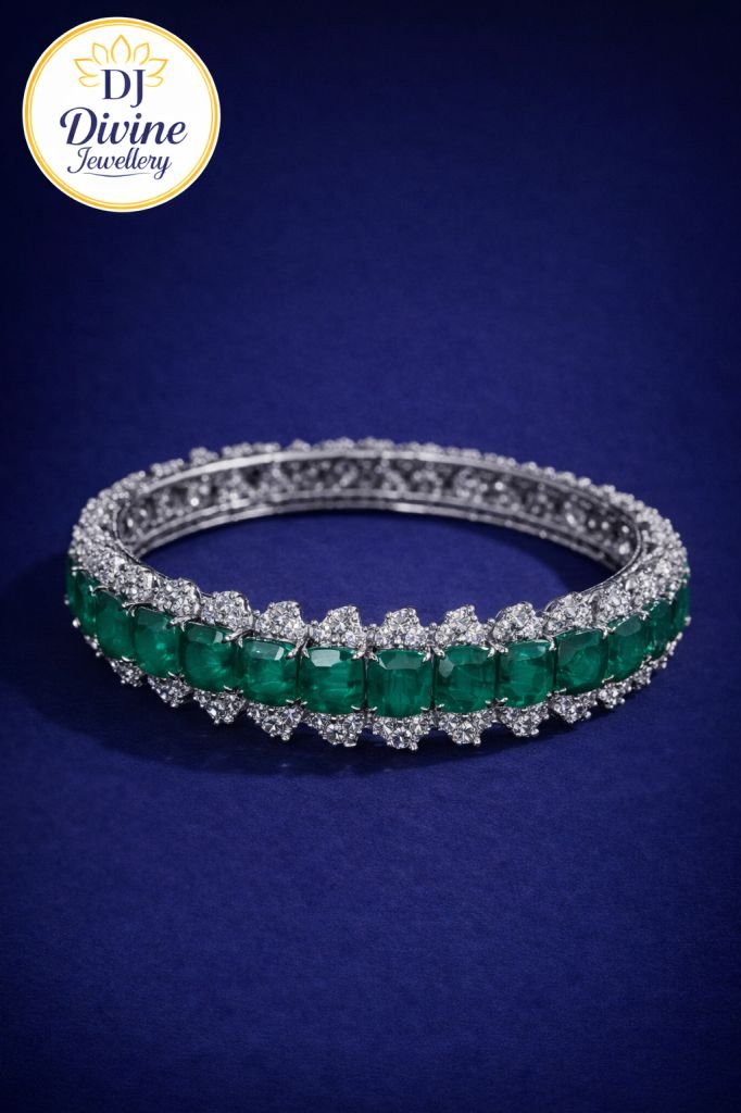 DIVINE Emerald & Diamond-Style Luxury Bangle – Elegant Green Stone Designer Bracelet for Wedding & Party Wear