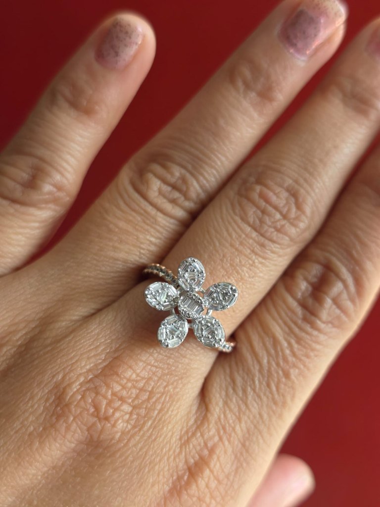 A delicate floral designer ring crafted with baguette and round crystals arranged in a blooming flower pattern. A perfect blend of softness, sparkle and luxury.