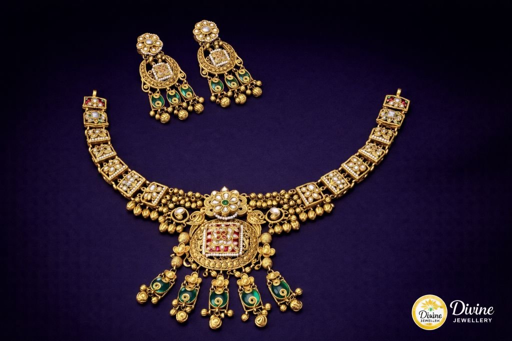 DIVINE Rajwada Bloom Antique Necklace – Handcrafted Temple-Style Choker with Meenakari Art and Matching Jhumkas masterpiece of traditional Indian craftsmanship by Divine Jewellery. This exquisite Antique Necklace features a central square medallion with floral Meenakari work, intricate gold bead textures, and vibrant emerald green droplet hangings.