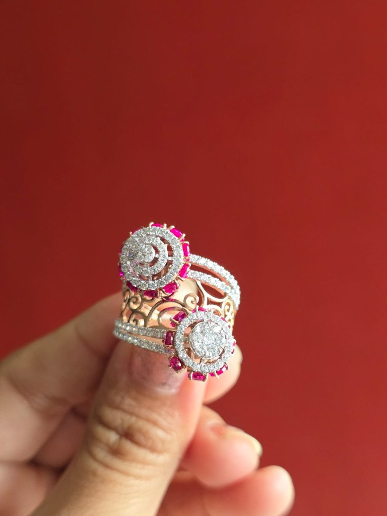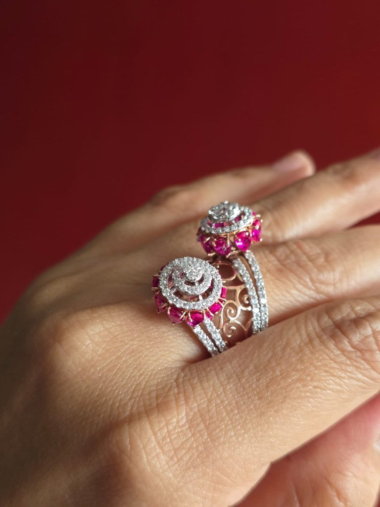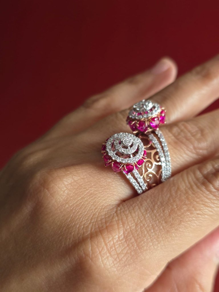 The DIVINE “Rosé Duet” Couture Ring is a celebration of refined drama and modern romance. Designed with two radiant halo medallions, this statement ring features a sculptural openwork band wrapped in warm rose gold tones and illuminated with brilliant white and ruby-hued crystals. Each halo glows like a constellation — layered, dimensional, and alive with light. The architectural filigree band creates a floating effect on the hand, while the ruby accents introduce depth, femininity, and a couture color story. This ring is designed for women who don’t accessorize — they curate. For evenings that demand elegance. For celebrations that deserve presence. For hands that tell stories before words ever do. DIVINE is not fashion jewelry. It is wearable luxury.
