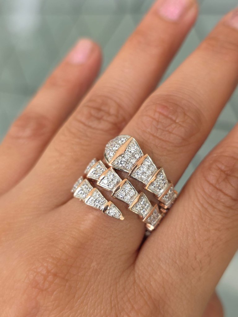 Power has a shape. So does elegance. The DIVINE “Serpente Lumière” Couture Ring draws inspiration from the timeless symbol of transformation and feminine strength. Sculpted in a striking serpent silhouette, this statement ring wraps gracefully around the finger in layered pavé-crystal segments that shimmer with fluid motion. Each faceted panel reflects light like moving scales, creating a luminous rhythm across the hand. The warm rose gold finish softens the bold structure, delivering a balance of sensuality and sophistication. This ring is designed for women who are unapologetic about presence. Who wear confidence as naturally as beauty. Who choose jewelry not to decorate — but to define. DIVINE crafts jewelry that doesn’t follow fashion. It creates identity.
