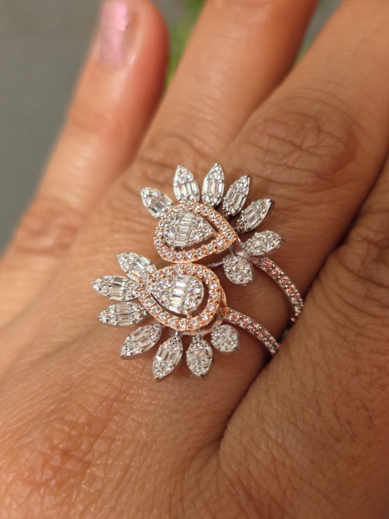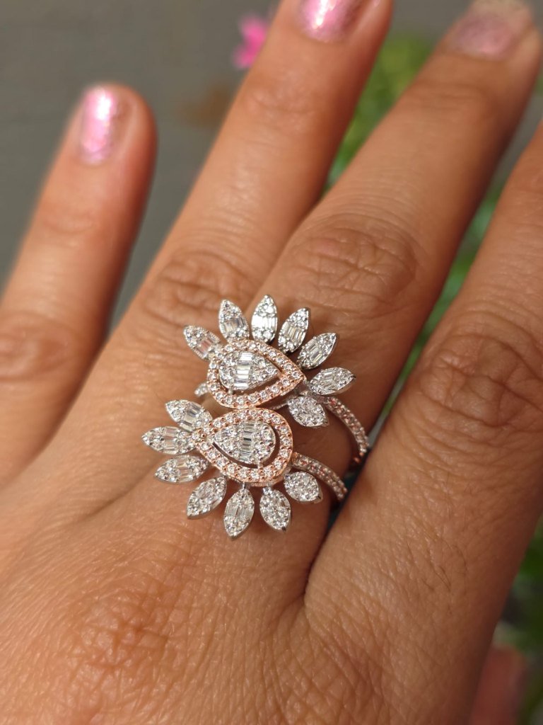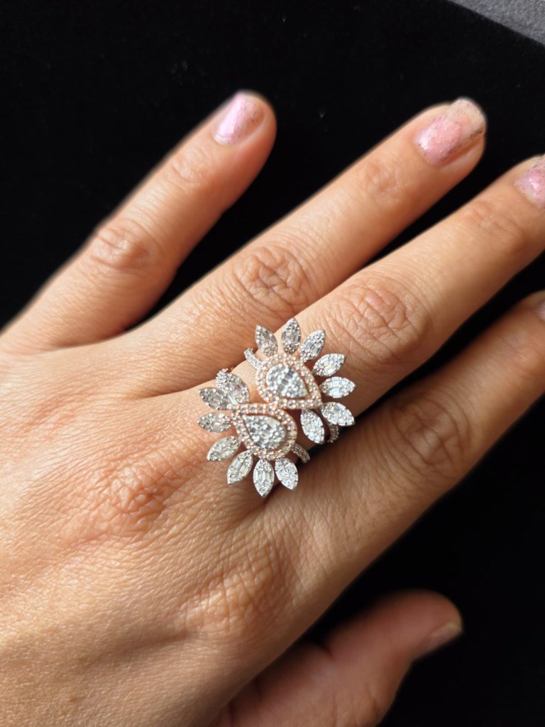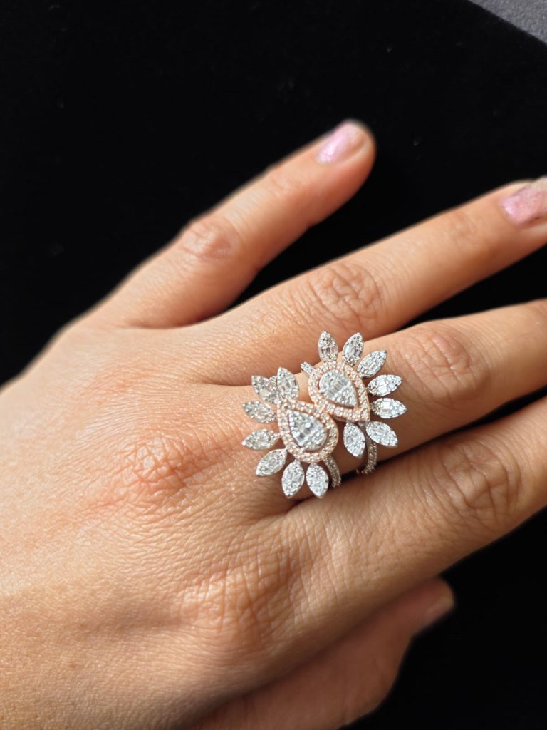 The DIVINE Twin Floral Halo Ring is designed for women who adore artistic jewellery with luxury depth. This masterpiece features two blooming floral clusters arranged in a graceful twin composition, giving the ring a rich high-jewellery presence.