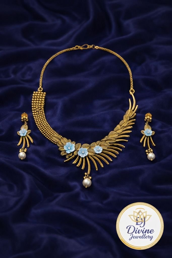 Designer Floral Gold Necklace Set with Blue Enamel Flowers & Pearl Drops – 92.5 Silver Gold Plated