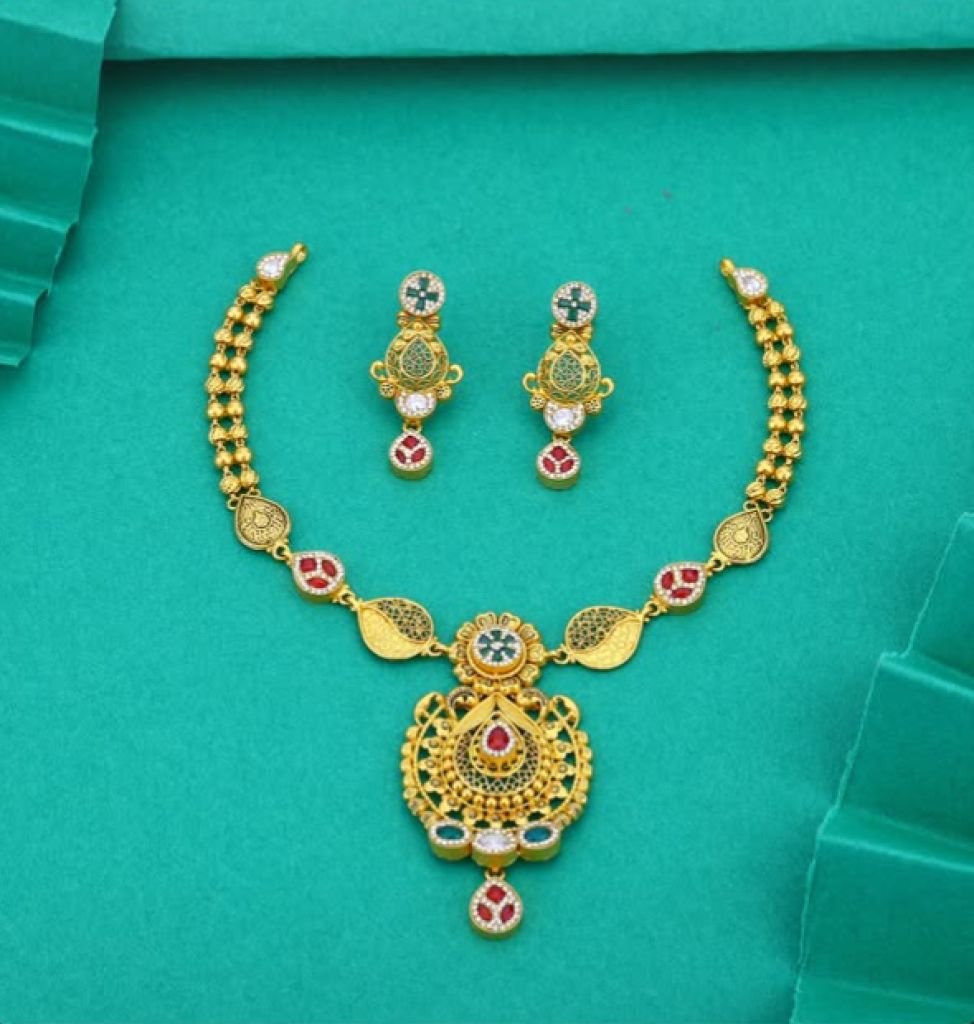 Elegant 92.5 silver gold plated necklace set featuring intricate filigree work, meenakari detailing, and matching earrings for a graceful traditional look.