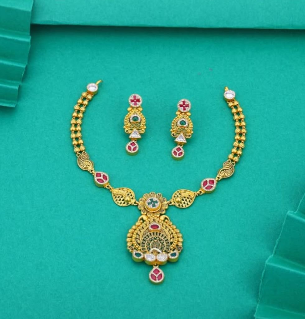 Elegant 92.5 silver gold plated necklace set featuring a floral fan-shaped pendant, intricate detailing, and matching earrings for a graceful traditional look.