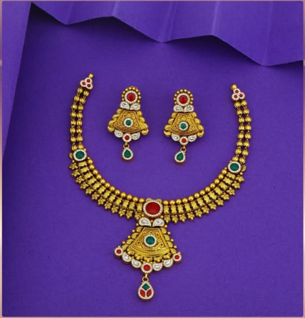 Divine Jewellery 92.5 Silver Gold Plated Antique Short Necklace Set with Meenakari Pendant & Matching Earrings