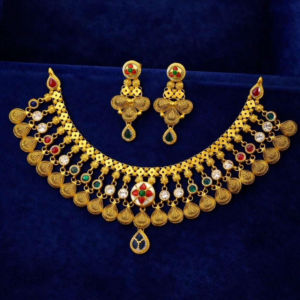 Divine Jewellery 92.5 Silver Gold Plated Temple Choker Necklace Set with Multi-Color Stones, Filigree Drops & Statement Earrings