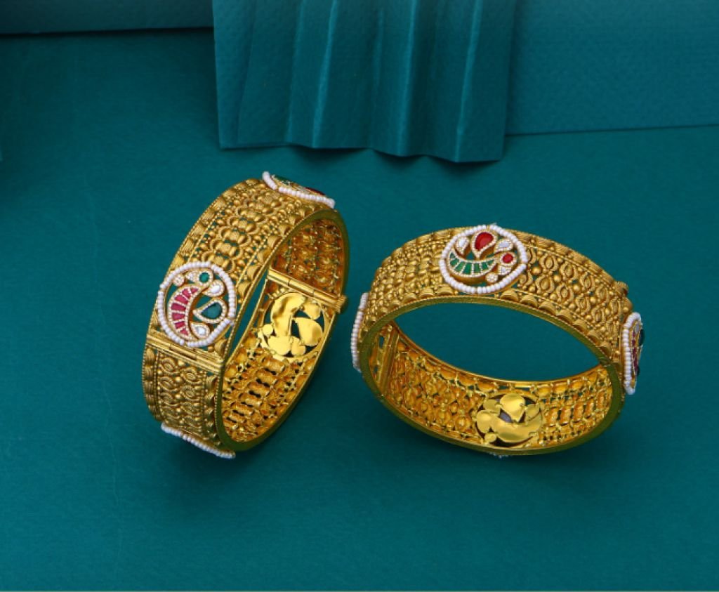 Traditional temple bangle set in 92.5 silver with gold plating, featuring peacock floral motif and kundan stone detailing.