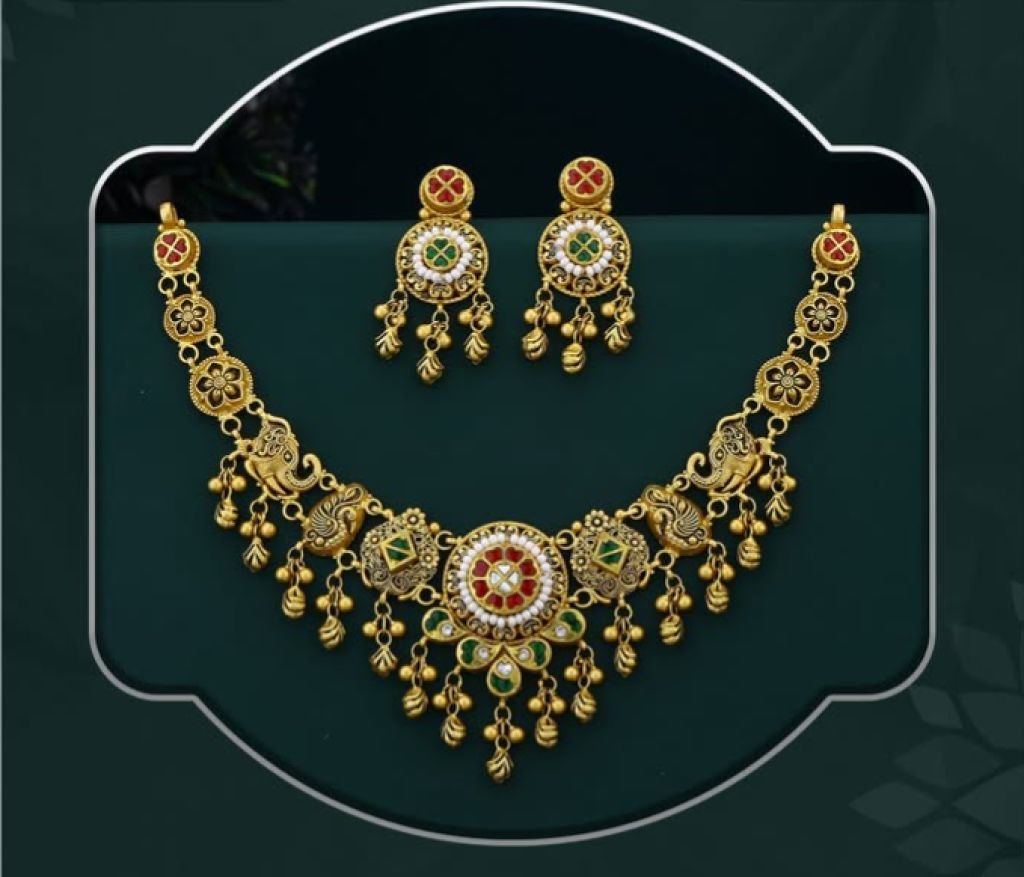 Celebrate timeless beauty with this 92.5 Sterling Silver necklace set by Divine Jewellery. Featuring majestic peacock motifs and a central circular mandala, this set is finished in a vintage antique gold plating and accented with delicate ghungroo droplets for a royal, traditional look.