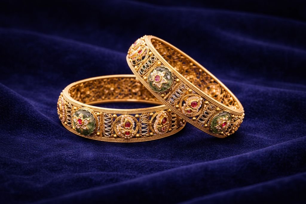 Elegant antique bangles with kundan detailing and meenakari floral accents.