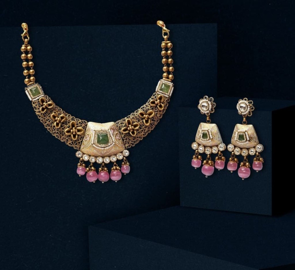 Traditional gold-plated 92.5 silver necklace set featuring antique filigree craftsmanship, green gemstone accents, and elegant pink bead drop detailing with matching earrings.