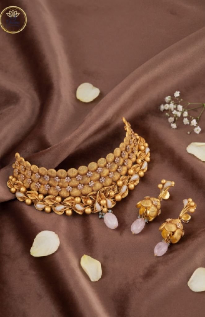 Divine Jewellery Antique Floral Temple Choker Necklace Set with Rose Quartz Drops